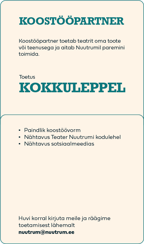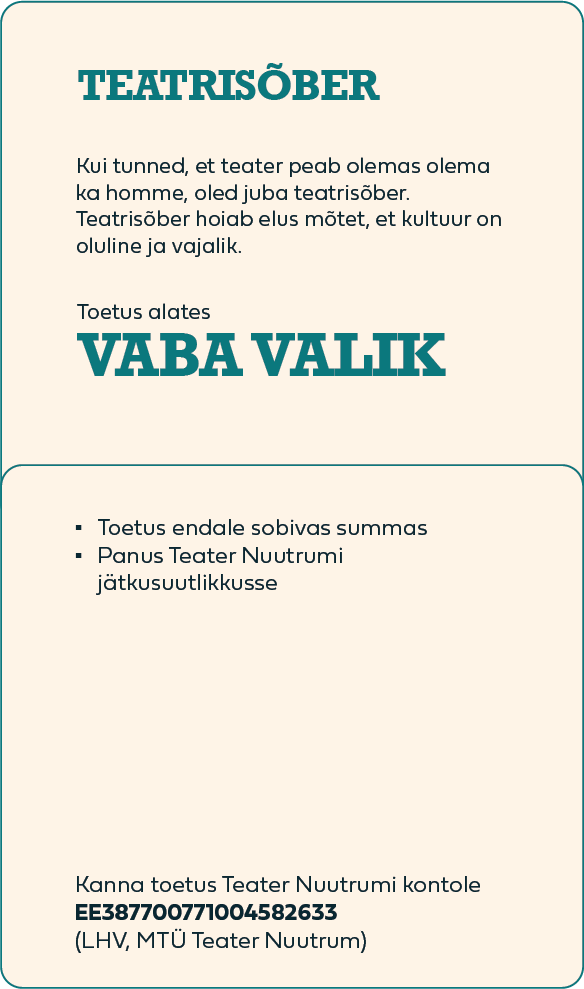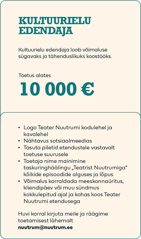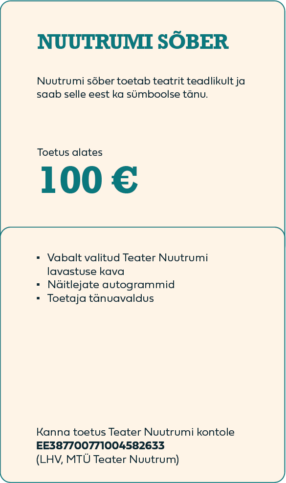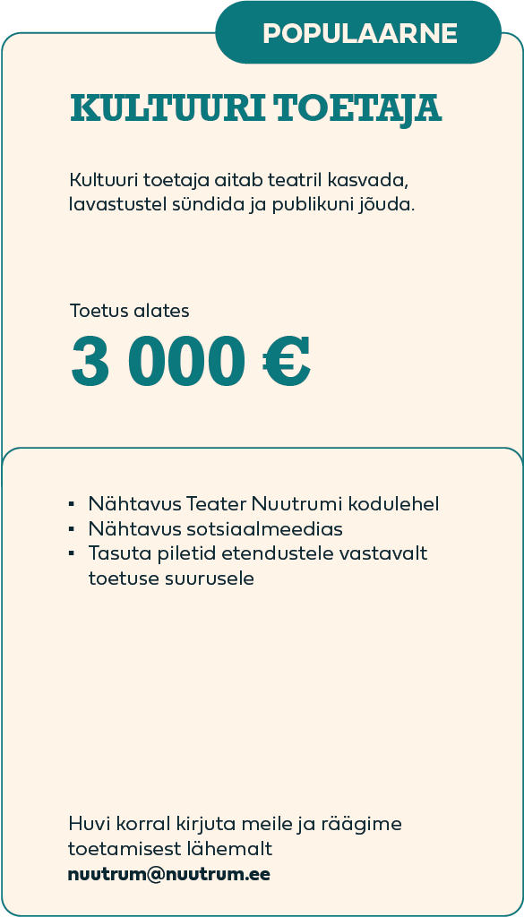 Teater sünnib inimestest, kes usuvad, et kultuuril on tähendus ka homme. Teater Nuutrumi toetajana aitad lavastustel sündida, ideedel kasvada ja publikuni jõuda.